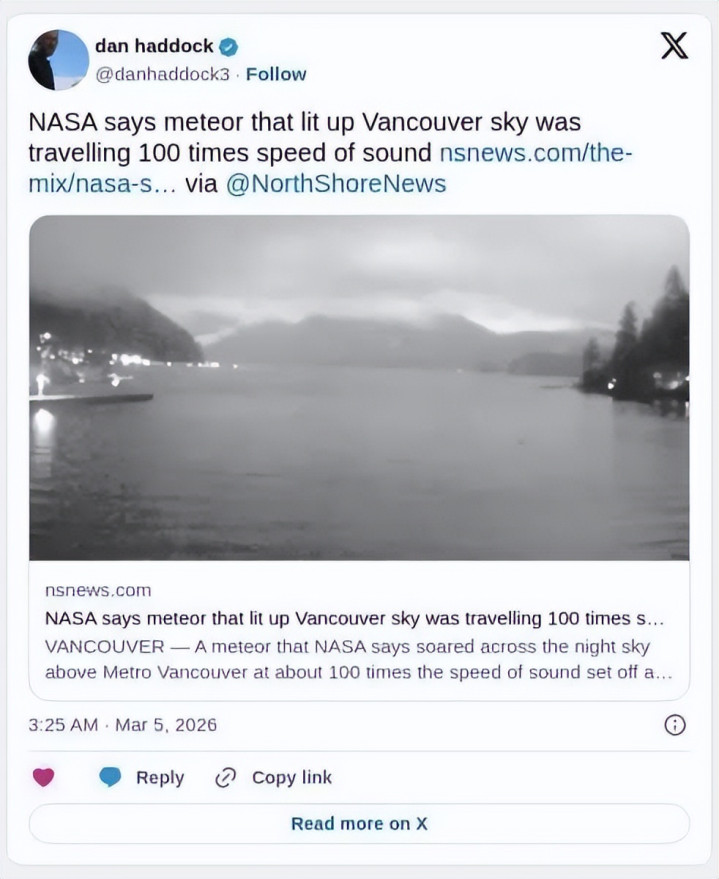 周二晚上,一颗以约音速100倍速率划过大温夜空的流星, 掀发火球、音爆,并在外交媒体上激发烧烈盘考。